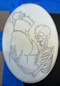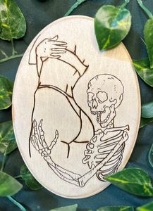 Looking for a cheeky blend of gothic and goofy? “The Skelly and The Booty” is a hand-burned original pyrography piece featuring a skeleton lovingly admiring a bare booty—yes, really. Crafted on a 5x7 inch natural wood oval, this artwork delivers a perfect mix of macabre charm and irreverent humor.