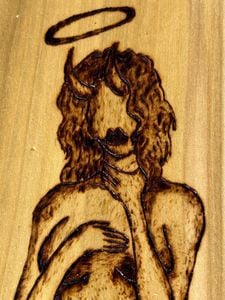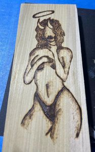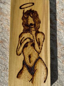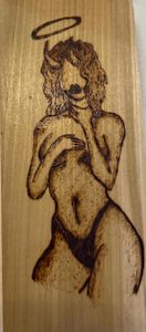 Celebrate softness, strength, and sensuality with this hand-burned nude figure, featuring a crowned halo and confident pose. Burned by hand onto a piece of reclaimed wood (8 1/4" x 3 1/2"), this artwork captures raw emotion and feminine power in minimalistic yet impactful pyrography.