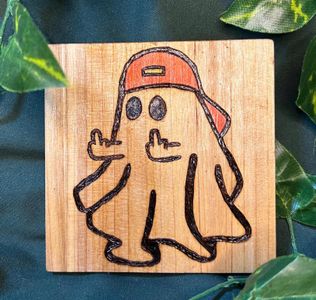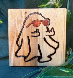 Product details for Hand Burned Ghost Coasters - Flip Off - 3x3in - 3 pack.